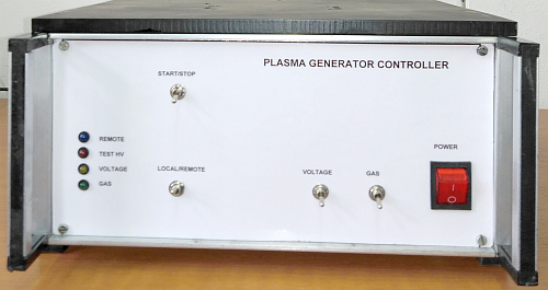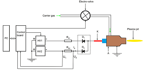 - HV1 source with an output voltage of about -7 kV, used to initiate the electrical discharge